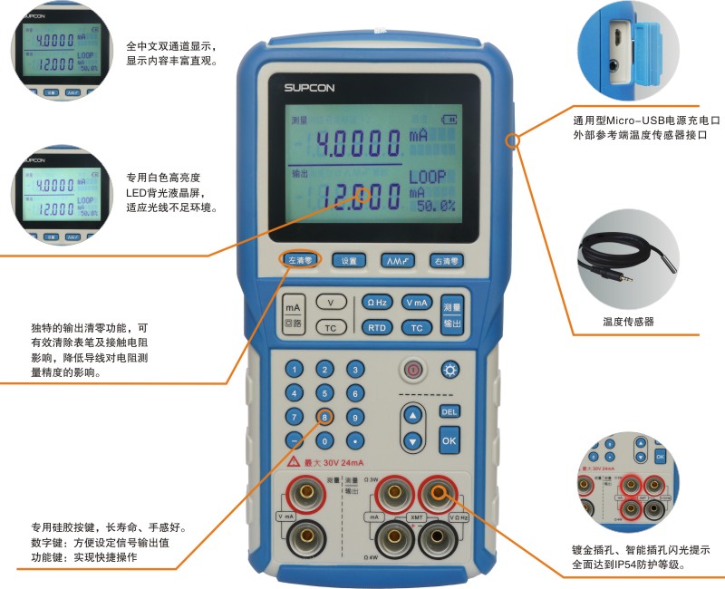 · 最高準確度:±0.01% · 外置傳感器典型準確度:±0.2℃ · 信號測量/輸出清零(líng) · 帶過流保護的24V直流(liú)電源 · 電壓測量/輸出 · 電流測量/輸出 · 24VDC配電/回路電(diàn)流測量 · 脈衝計數 | · 幅值(zhí)可調的脈衝信號輸出 · 頻率測量/輸出 · 電阻測量/輸出(chū) · 引(yǐn)線電阻補償功能 · 14種RTD、TC測量/輸出 · 測量/模擬(nǐ)低於0℃的熱電勢值 · 內置90國際溫標雙向查表 · 攝氏度(dù)及華氏(shì)度溫標切換 | · 手動和自動冷端補償 · 模擬二線製變(biàn)送器信號(hào) · 自(zì)動步進和斜坡輸出 · 小型化設計,便於手持攜帶 · 智能閃光(guāng)插孔指示 · 中文(wén)操作界麵(miàn) · Micro USB電源充電口 · 防護等(děng)級IP54 |
